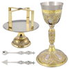 Δισκοπότηρο ορειχάλκινο σκαλιστό δίχρωμο σε διάσταση : 26 εκ. Το σετ περιλαμβάνει 5 τεμάχια : Άγιο Ποτήριον, Δισκάριο, Αστερίσκο, Λόγχη, Λαβίδα.