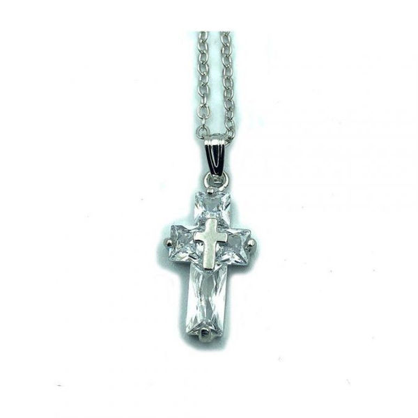 Γυάλινο Σταυρουδάκι λαιμού με διάφανα κρυσταλλάκια και αλυσίδα 55 εκατοστών χρώματος ασημί σε διάσταση : 2 x 1 εκ. Προσφέρεται σε βελούδινο κουτάκι πολυτελείας.