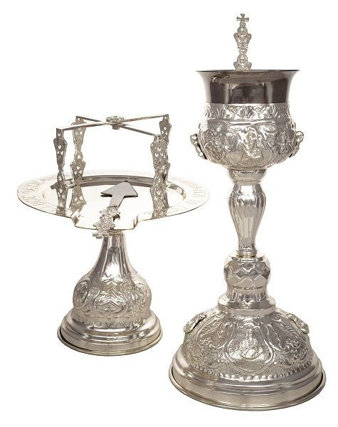 Δισκοπότηρο ορειχάλκινο σκαλιστό επάργυρο χωρητικότητας 500ml σε διάσταση : 33 x 17 εκ. Δισκάριο ορειχάλκινο σκαλιστό επάργυρο σε διάσταση : 21 x 17 εκ.