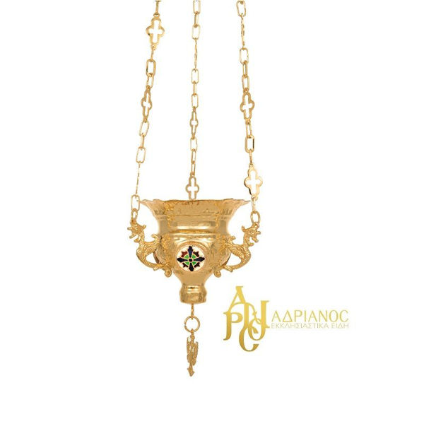 Καντήλι Εκκλησίας κρεμαστό ορειχάλκινο Βυζαντινό σκαλιστό επίχρυσο με σμαλτάκια σε διάσταση : 11 x 10 εκ.