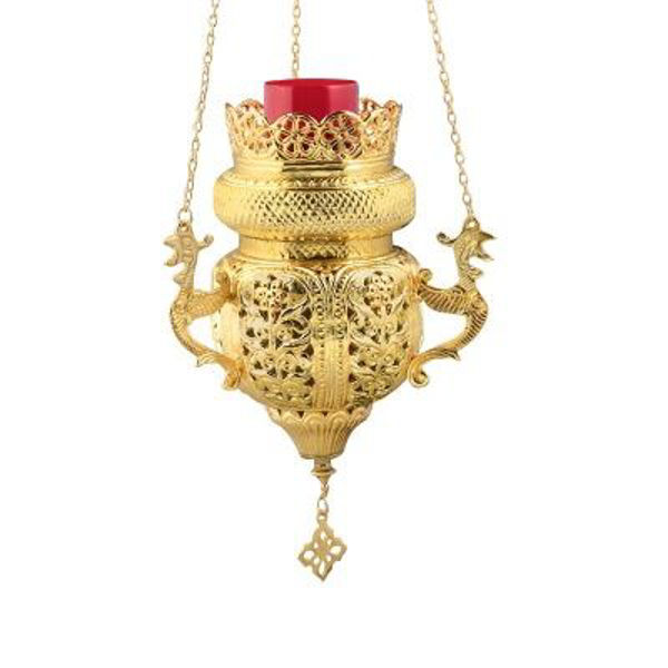 Καντήλι Εκκλησίας ορειχάλκινο κρεμαστό σκαλιστό επιχρυσωμένο σε διάσταση : 26 εκ.