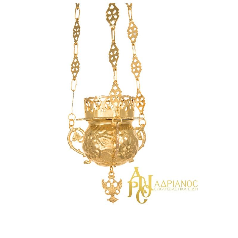 Καντήλι Εκκλησίας κρεμαστό ορειχάλκινο σκαλιστό επίχρυσο με στεφανάκι σε διάσταση : 12 x 9 εκ.