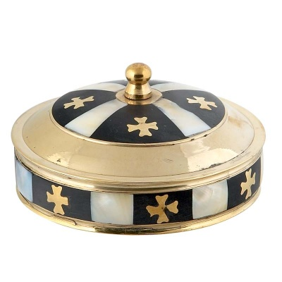 Λειψανοθήκη στρογγυλή επίχρυση με φίλντισι σε διάσταση : 9 εκ.(διάμετρος) x 4,5 εκ.(ύψος)