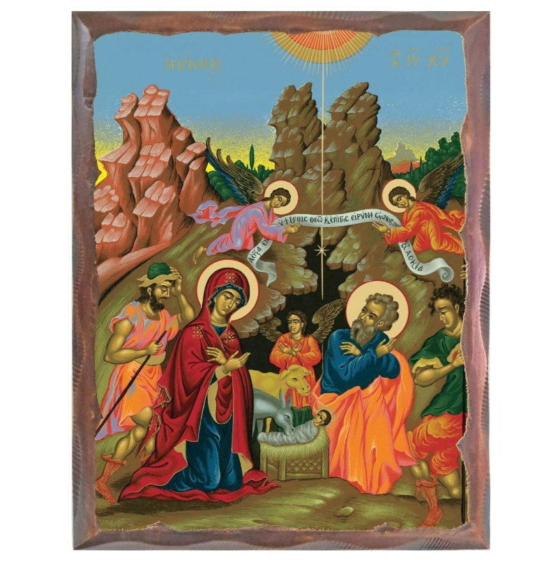 Η Γέννηση σε πεπαλαιωμένο πελεκυτό ξύλο πεύκο σε καμβά με φύλλο χρυσού και διάσταση : 20 x 16 εκ.