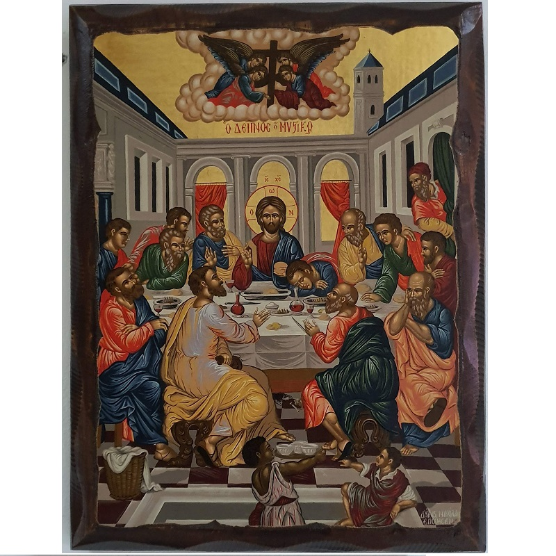 Μυστικός Δείπνος σε πεπαλαιωμένο πελεκυτό ξύλο πεύκο σε καμβά με φύλλο χρυσού και διάσταση : 20 x 16 εκ.