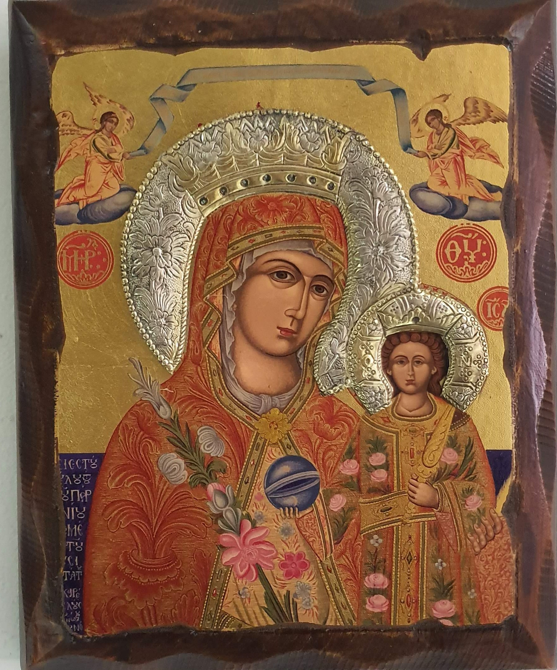 Παναγία Ρόδον Αμάραντον σε καμβά με φύλλο χρυσού, ασημένιο φωτοστέφανο και διάσταση : 15 x 12 εκ.