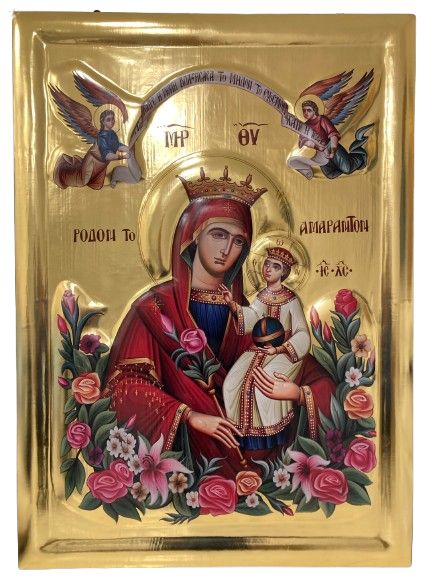 Παναγία Ρόδον το Αμάραντον με φύλλο χρυσού 24K σε ξύλο πεύκο ρόμπολο και διάσταση : 110 x 80 εκ.