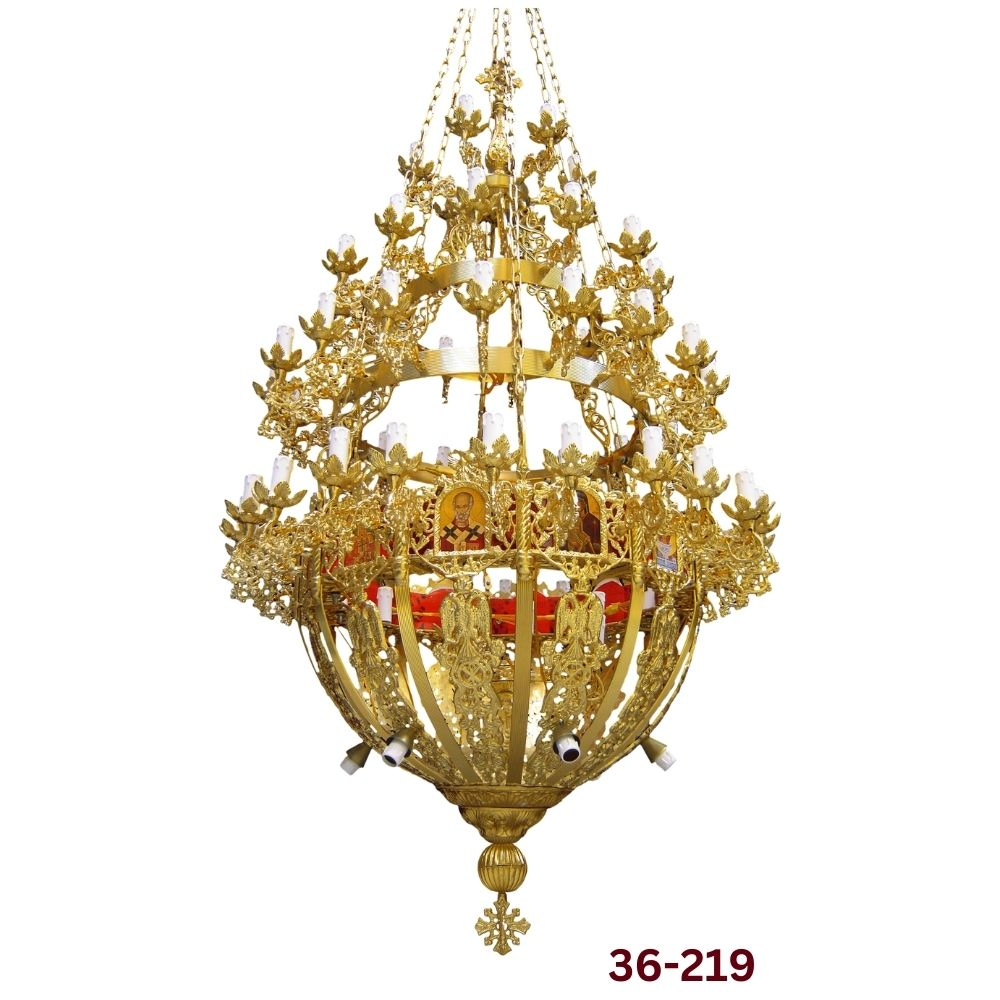 Πολυέλαιος αλουμινίου με εικόνα αγίου με 80 φώτα σε 2 αποχρώσεις και διάσταση : 185 x 105 εκ.