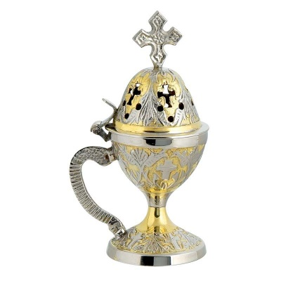 Θυμιατό οικιακό ορειχάλκινο σκαλιστό δίχρωμο με διάτρητους σταυρούς σε διάσταση : 14 εκ.