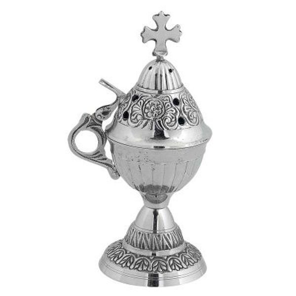 Θυμιατό οικιακό ορειχάλκινο σκαλιστό επινικελωμένο με λουλούδια σε διάσταση : 17 εκ.